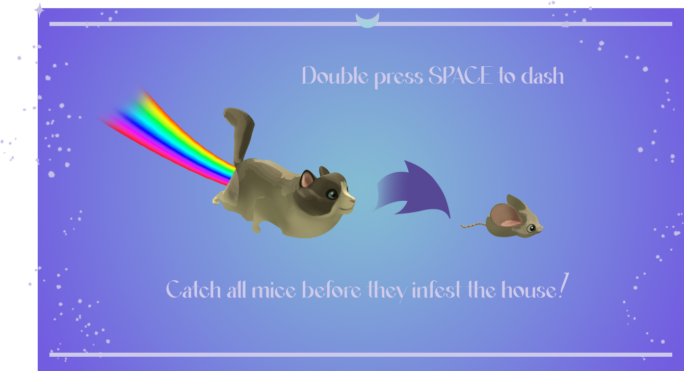 Race through the house, zoom, blast, and rainbow-boost your way to the ultimate mouse-hunting score. It starts calm… but zoomies always escalate.